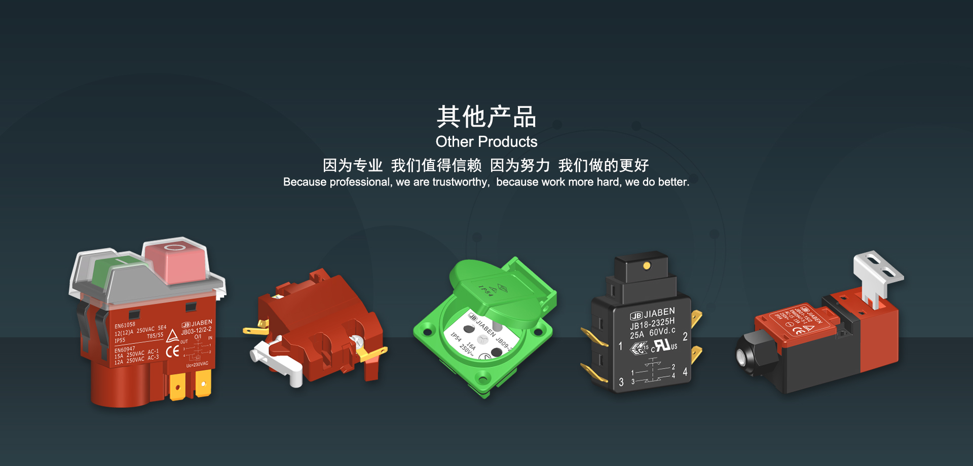 浙江佳奔電子有限公司始建于1986年,坐落于浙江省樂清市虹橋鎮(zhèn)東電子信息產(chǎn)業(yè)園內(nèi),現(xiàn)有職工700多人,資產(chǎn)總額超3億元。公司主要經(jīng)營“JIABEN”牌微動開關(guān)、蹺板開關(guān)、按鈕開關(guān)、扳機開關(guān)、調(diào)速開關(guān)和電位器開關(guān)等各類交、直流器具開關(guān)和各類交、直流線路板模塊等產(chǎn)品,主要應用于交、直流電動工具、電動園林工具、清潔器具、家用電器和小型機床等行業(yè),是集產(chǎn)品設(shè)計、研發(fā)、制造、銷售和服務于一體的國家高新技術(shù)企業(yè)。JIABEN was founded in 1986, located in East Electronic Information Industry Park, Hongqiao Town, Yueqing City, Zhejiang Proviance, existing staff more than 700 peoples, more than 300 million RMB worth of assets. Company is mainly engaged in "JIABEN" brand Micro Switch, Rocker Switch, Push-button Switch, Trigger Switch, Speed Regulating Switch, Potentiometer Switch and other kinds of appliance switch and all kinds of AC or DC circuit board module, such as more than 100 series, 8000 kinds of models of products, mainly used in AC or DC Power-tools, Power Gardening Tools, Cleaning Appliances, Household Appliances and Small Machine Tool and other industries, is the collection product design, research and development, manufacturing, sales and service in one of the national high and new technology enterprise.